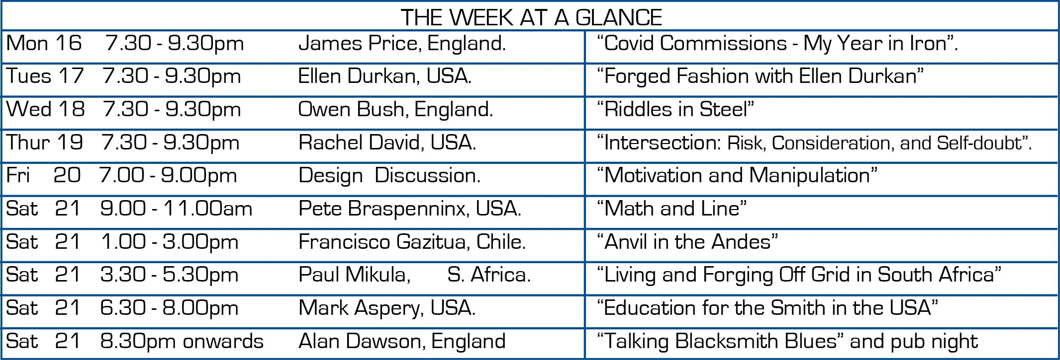 We have an exciting line-up of 12 very varied speakers coming to your screen from around the globe including smiths from Canada, Chile, South Africa, Tasmania, UK, and USA. Please see below for the full event Programme.