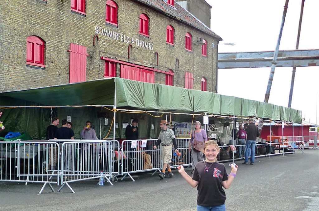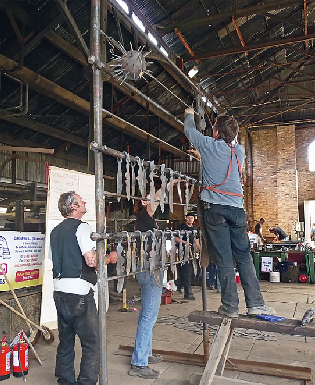 The first gig in the tour took place right on King’s Lynn dock as part of the town’s Hanse Festival. It was here that work began on a large piece of sculpture that will stand on the dockside to commemorate its links with the historic Hanseatic League of trading ports. Nigel Barnett developed the whole project together with King’s Lynn Borough Council. Bethan Griffiths produced a design that not only fulfilled the resulting brief, but also took account of the fact that it would be produced at a forge-in. The piece takes the form of two large fish drying racks to which are attached by means of hooks some 160 different fish.
