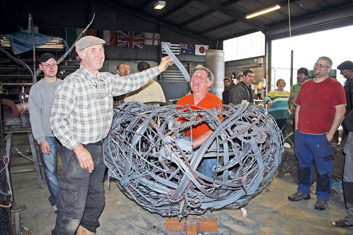 There was a lot of random forging as well of course and after we brought proceedings to a halt on the Sunday at five o'clock by turning off the power, we had a nice bird's nest. This isn't a euphemism for anything, we really did have a giant bird's nest, with a giant bird to go in it, thanks to the French contingent. The bird and nest now sit five metres high on a cast iron column we had left over from a bandstand and stands on the industrial estate as our first piece of industrial sculpture.
