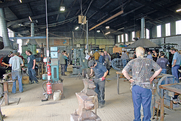 equipment in there that we use most days for rolling wrought iron, and a number of people had expressed a desire to come and play. Hence the Roll-In. About sixty smiths booked in, some with their partners, so we were a bit apprehensive about fitting them all in. As it happened, they all behaved themselves, even with the beer in them during the evening hog roast in the workshop.